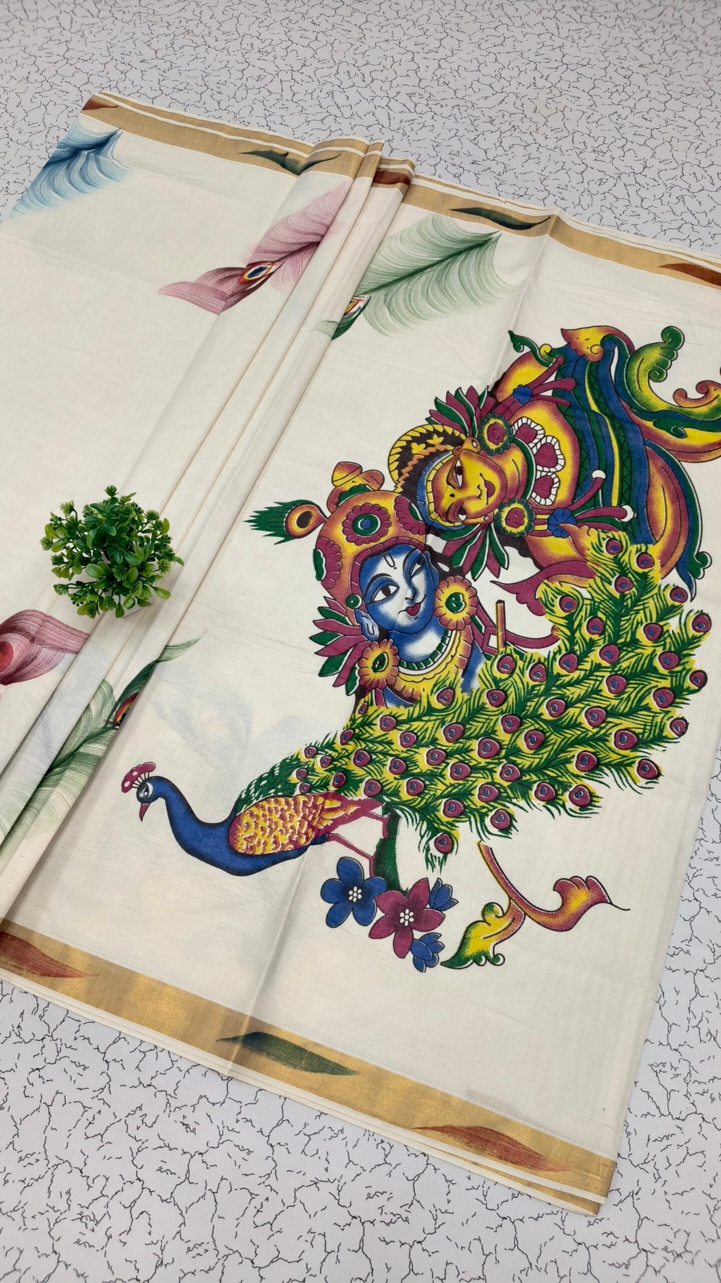 Kerala Floral Classic Printed Saree – Radha Krishna Peacock – 003